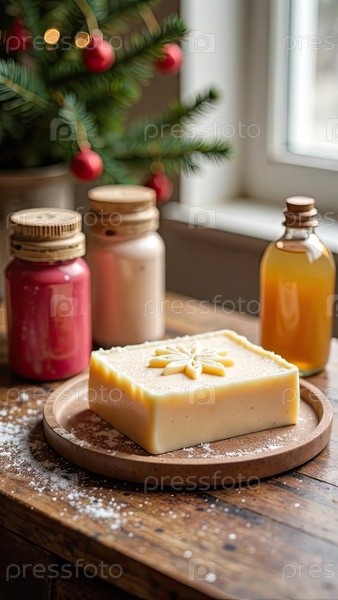 Ручно сделанное натуральное эко мыло на столе с бутылками с ароматизатором, красителем и основой для мыла на рождественском фоне. Подарок, подарок, ремесло на Новый год и Рождество. Производство любительского мыла, домашнее изготовление. ИИ генерируется;