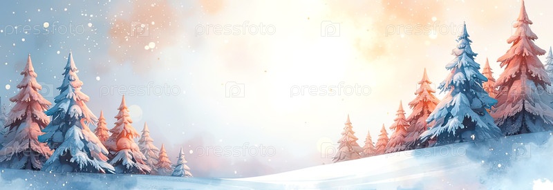 Акварель Зимний фон с лесом снежных елей с пространством для текста в рождественской и новогодней поздравительной карточке, приглашение