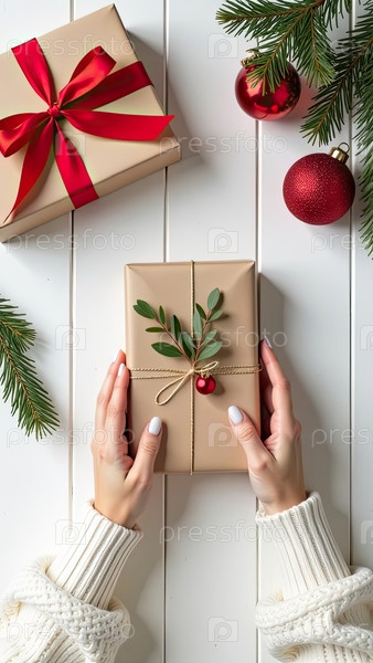 Упаковать подарок на Рождество и Новый год в крафт-бумаге, привязанный веревкой с луком с рождественским декором на белом столовом столе, натуральный декор. Праздничное настроение. Flatlay, background, copy space. AI generated