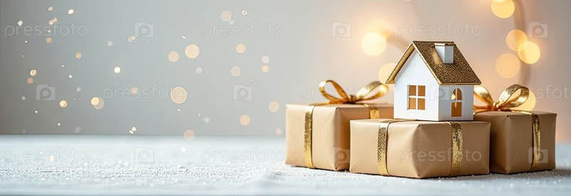 Золото-белый символический дом и подарочная коробка под рождественской елкой на столе Рождественский фон с золотым блестком на поздравительной карточке