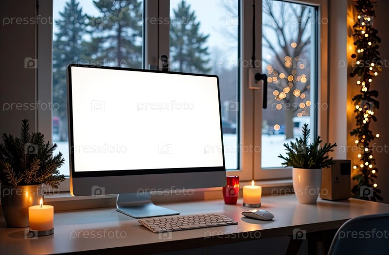 Компьютерный монитор с белым экраном макет на столе в уютном домашнем офисе рождественского декора с елкой и окном со снежной зимой снаружи