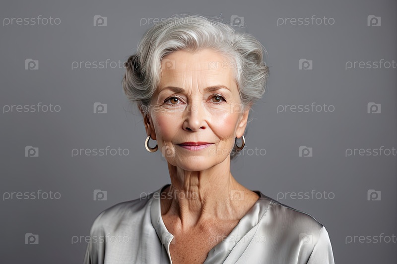 Уверенная старшая женщина с седыми волосами в серебряной блузке позирует в студии, элегантность, зрелая грация, позитивное отношение, вневременный образ жизни