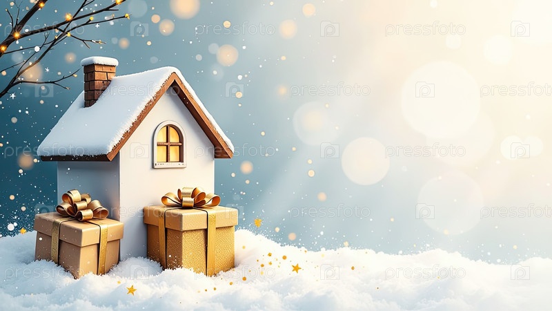 Уютный дом с акварелью и коробка для подарков под елкой на рождественском зимнем снежном фоне с золотыми блесками на поздравительных открытках. недвижимость, риэлтор, ипотека, страхование, бронирование. ИИ генерируется
