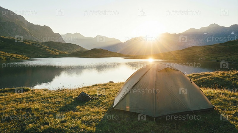 Палатка, установленная на травянистом берегу у горного озера при восходе солнца, спокойное место для кемпинга, бегство от природы, путешествия на свежем воздухе, утренние приключения