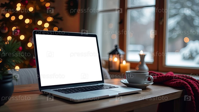 Ноутбук с белым экраном макет на столе в уютном домашнем офисе рождественского декора в стиле лофт