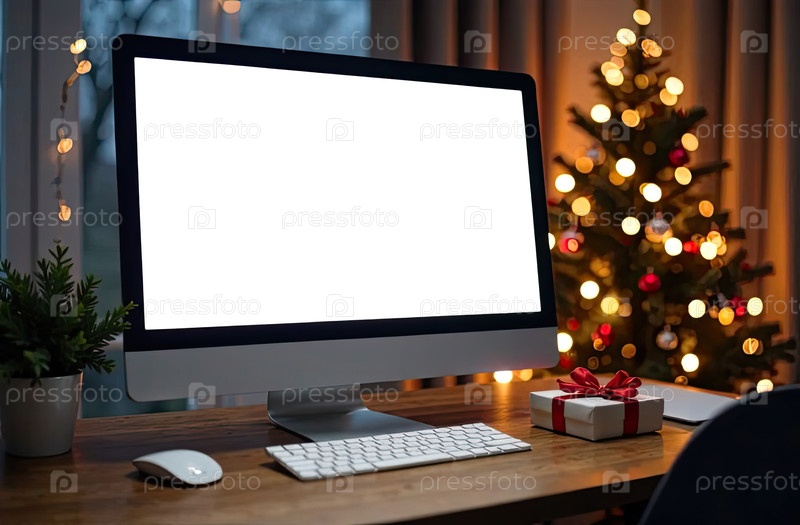 Компьютерный монитор с белым экраном макет на столе в уютном домашнем офисе рождественского декора с елкой и окном со снежной зимой снаружи