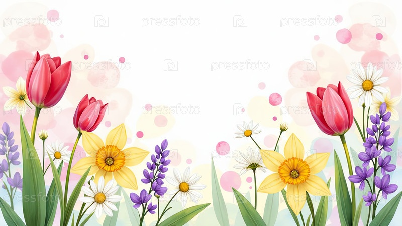 Рамка акварели с весенними цветами тюльпаны, нарциссы-Весенняя открытка со свободным местом для текста на 8 марта, женский день, Пасху