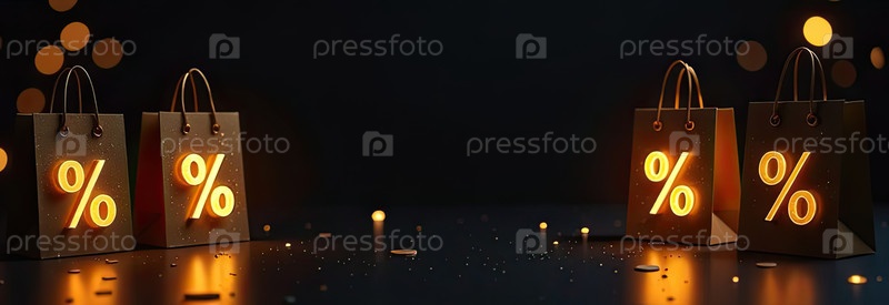 Торговые пакеты с знаками процента со свободным местом для текста на черном фоне. Покупки и скидки, распродажа в Черную пятницу, баннер, флаер. ИИ генерируется