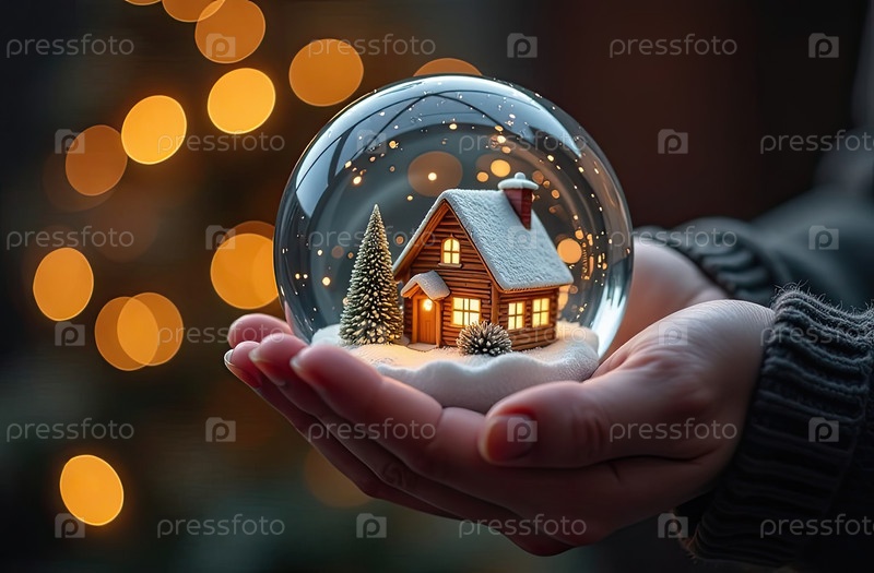 Магический стеклянный шар с крошечным современным домом и снегом внутри в уютной руке с рождественской елкой с гирляндами на фоне. страхование, ипотека, покупка недвижимости. ИИ генерируется