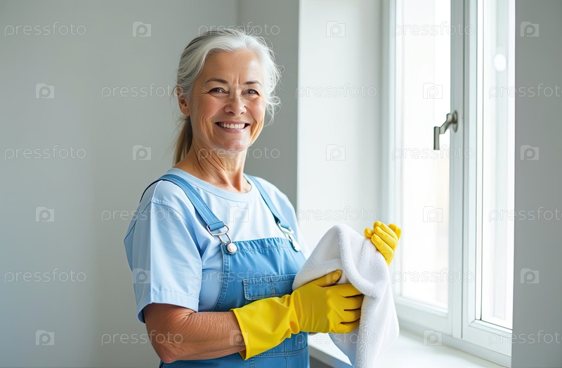 Портрет взрослой женщины в синем фартуке и желтых резиновых перчатках с тряпкой в руке у окна против белой стены, служба очистки окон, уборка дома