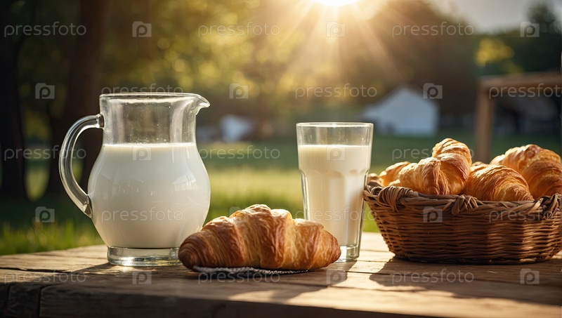 Свежее деревенское коровье молоко в кружке и белый ароматный хлеб и выпечка на столе на фоне луга, где пасутся коровы