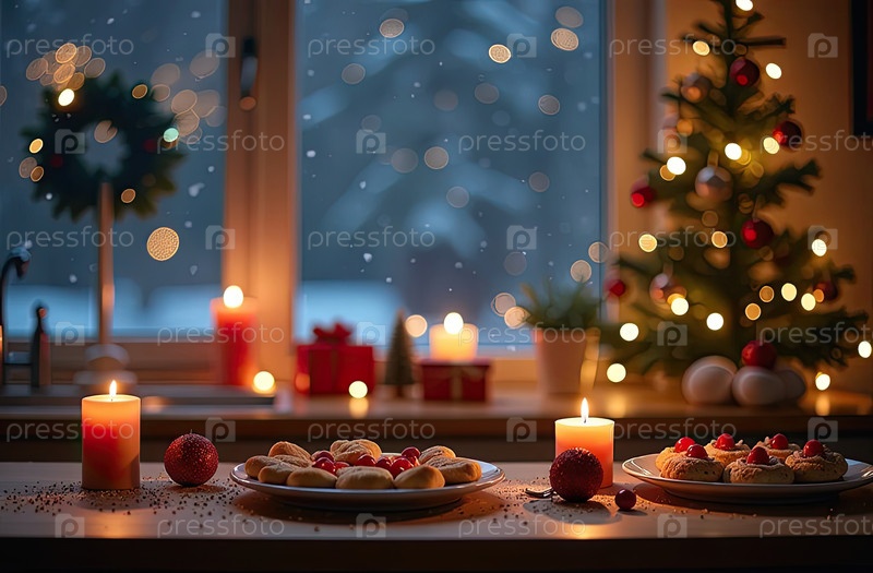 Установка праздничного рождественского стола в оформленном интерьере с большим окном и елкой. новогодний ужин, банкет для гостей. созданный ИИ