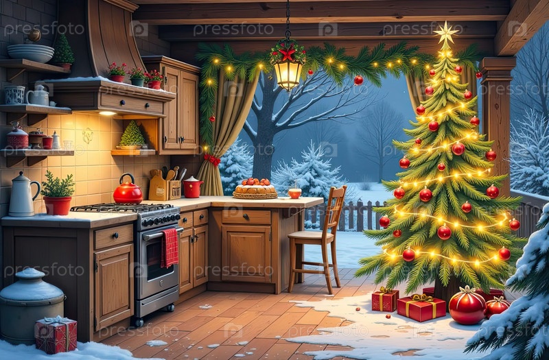 Рустический интерьер уютной рождественской кухни, новогоднее настроение, подготовка к празднику, посуда. Рождественский декор снежной кухни с приготовленным ужином. ИИ генерируется