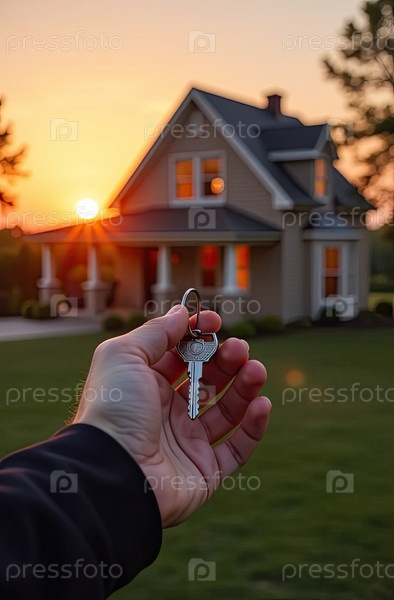 Ключ от дома в руках агента по недвижимости рядом с коттеджем - продажа, перемещение, бронирование, проект коттеджа, ипотека, жилищное страхование
