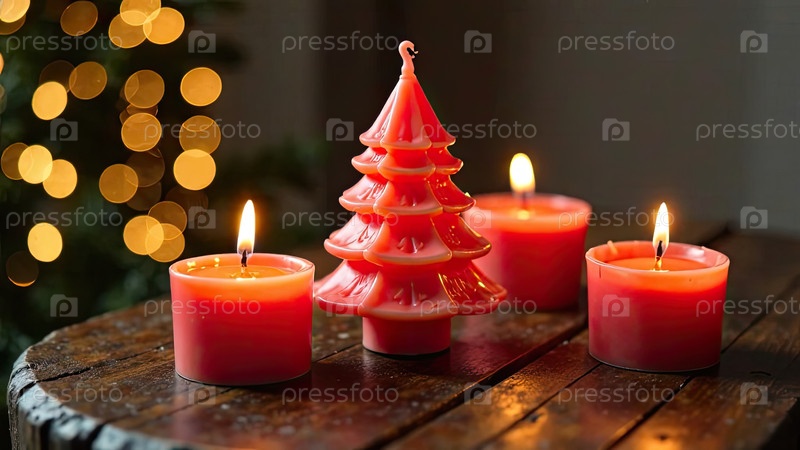 Ручная свеча в форме елки на рождественском фоне. Подарок, подарок, ремесло для Нового года и новогоднего подарка. Хоби-свечи и мыльное производство, домашнее изготовление. ИИ генерируется;