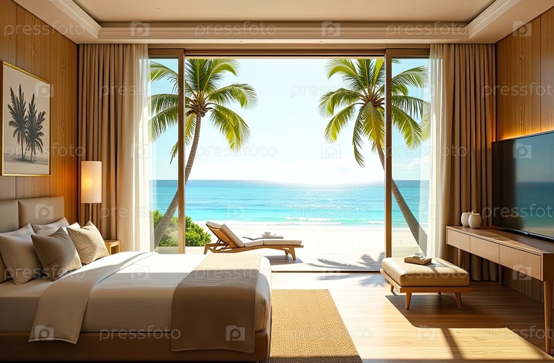 Интерьер гостиничного номера с видом на океан для пляжного отдыха и путешествий