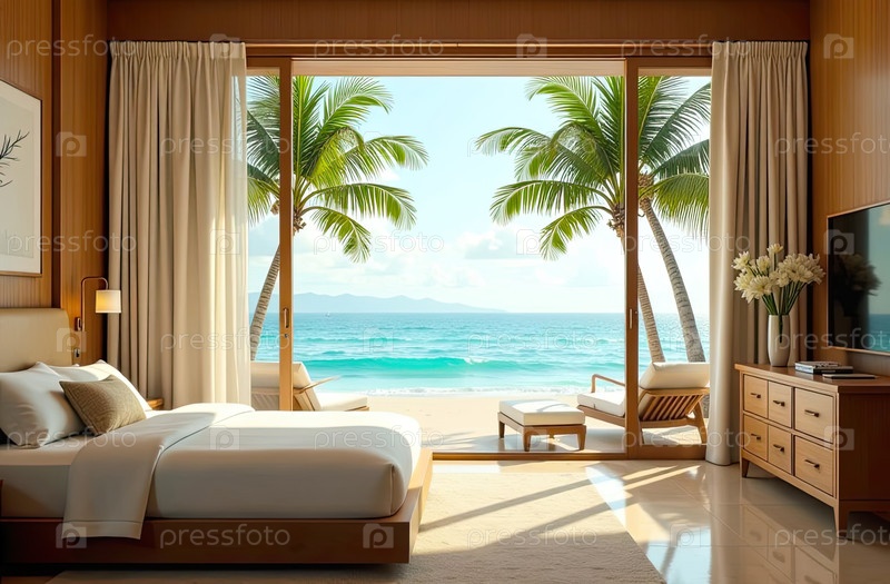 Интерьер гостиничного номера с видом на океан для пляжного отдыха и путешествий