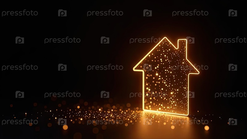 Прозрачное золото светящийся символ дома на черном фоне с золотым блеском. недвижимость, риэлтор, ипотека, страхование, бронирование, строительство, изоляция, отопление. AI generated