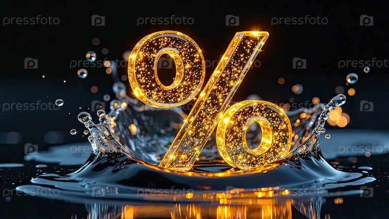 Светящийся золотой процентный знак в освежающем брызге воды над водой. жаркие летние распродажи и скидки, горящие баннеры туров, листовки. ИИ генерируется