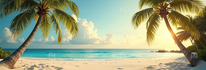 Панорама тропического райского пляжа с пальмами и белым песком на берегу океана. поездка к морю в теплом летнем климате, туристический отдых. ИИ генерируется