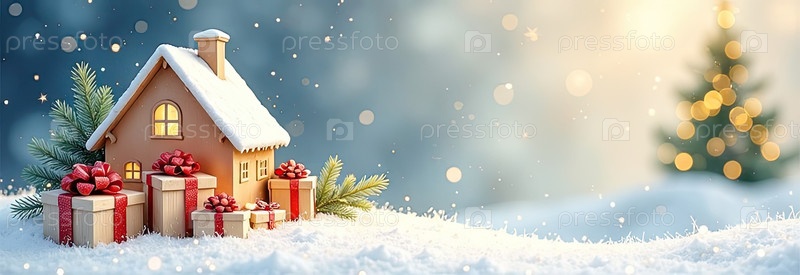 Уютный дом с акварелью и коробка для подарков под елкой на рождественском зимнем снежном фоне с золотыми блесками на поздравительных открытках. недвижимость, риэлтор, ипотека, страхование, бронирование. ИИ генерируется