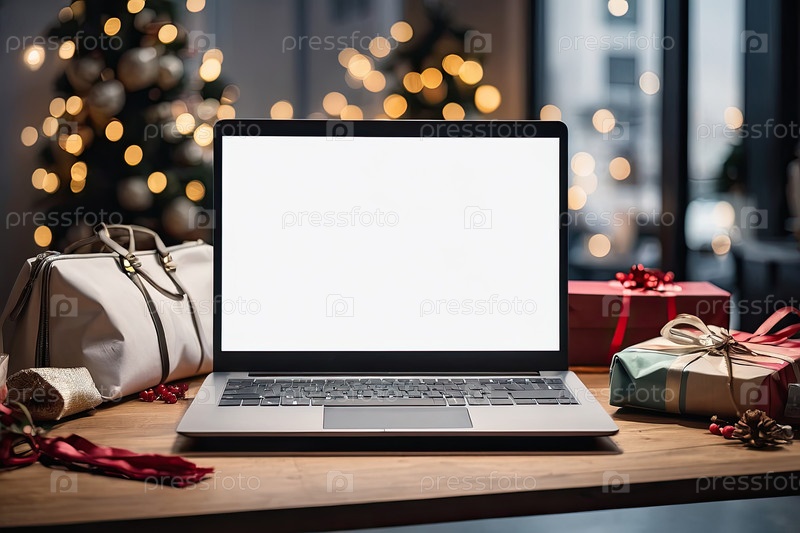 Ноутбук с белым экраном макет на столе в офисе в торговом центре рождественского декора с сумками, сумочками для покупок, пакетами, Черная пятница,