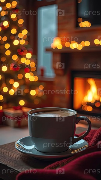Теплая чашка кофе возле камина в уютном теплом трикотажном платье и рождественский декор.Уютная зима, Рождество, Новый год. ИИ генерируется