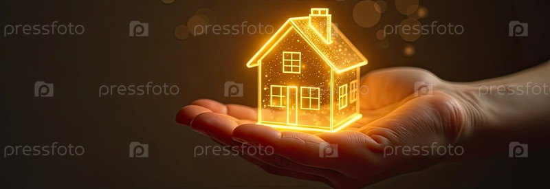 Золото светящийся символ уютного дома В ладонях рук с золотым блеском. Недвижимость, риэлтор, ипотека, страхование, бронирование, изоляция, мечта о собственном доме. ИИ генерируется