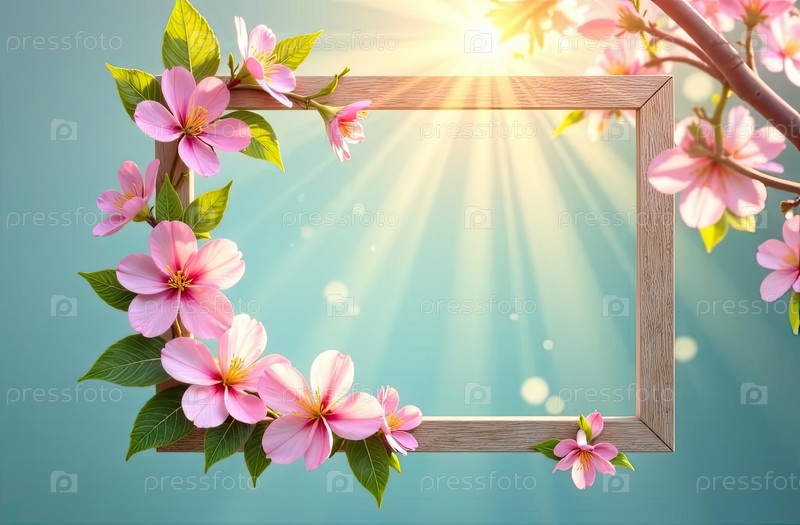 Прямоугольная деревянная декоративная рама с текстом внутри в солнечных лучах, украшена весенними пастельными цветами на весенне-синем фоне