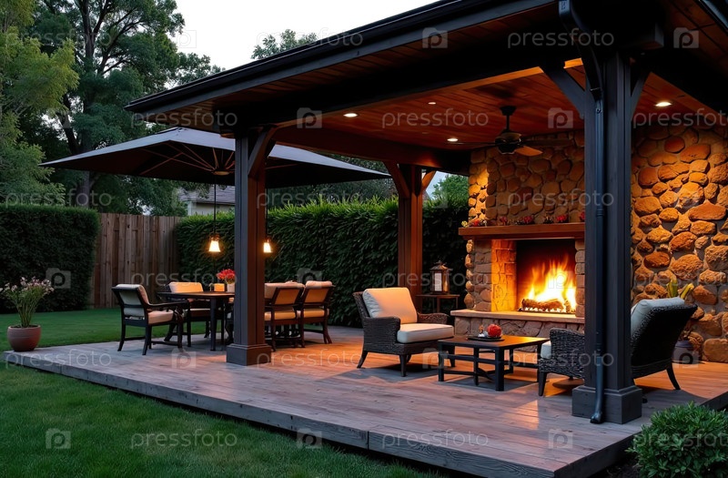 Газебо с зоной для барбекю во дворе дома с барбекью, плитой, столом, крышей