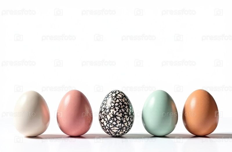 Внизу изображения пять яиц со свободным пространством сверху для текста, творческий цветочный черный рисунок на цветах-яйцах, белый фон. Пасхальный баннер с пробелом для текста. ИИ генерируется