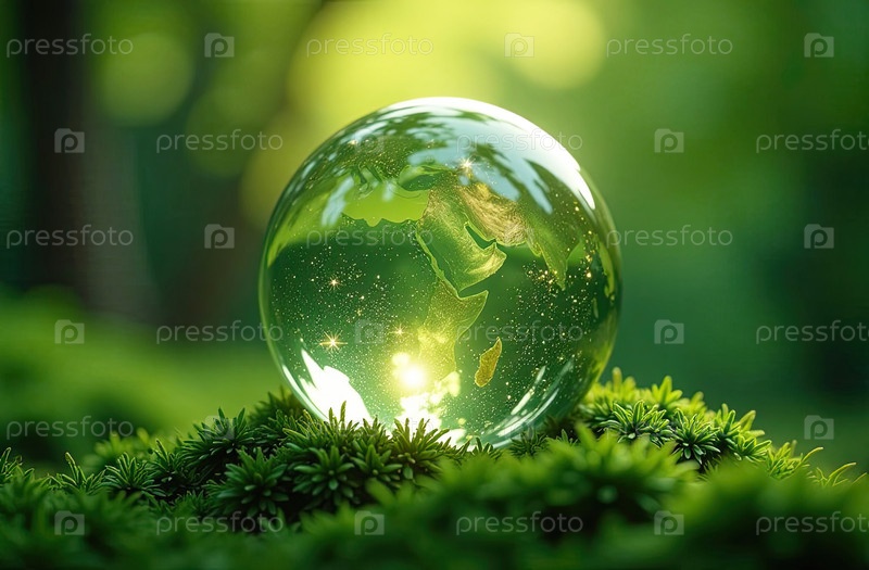 Стеклянная светящаяся сфера планеты Земля в лесу - это шар с внутренним микроклиматом, чистой окружающей средой, защищающий экологию планеты
