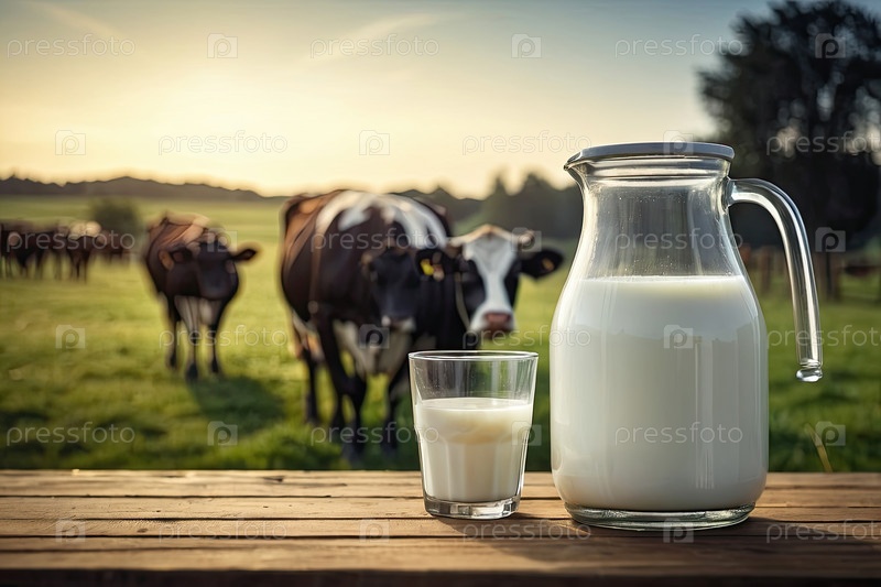 Свежее деревенское коровье молоко в кружке на столе на фоне луга, где пасутся коровы