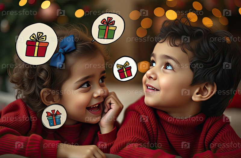 Круглые волосы мальчика и девочки в свитерах мечтают о подарках на Новый год - большие мультфильмы, нарисованные кругами со символами подарков внутри