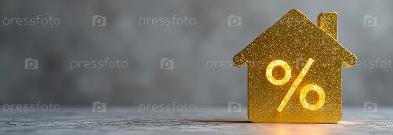 Золотой светящийся символ процент в доме на сером бетонном фоне с золотым блеском. строительство жилья, скидка, купон, покупка, продажа, риэлторская деятельность, ипотека, страхование, бронирование. AI generated