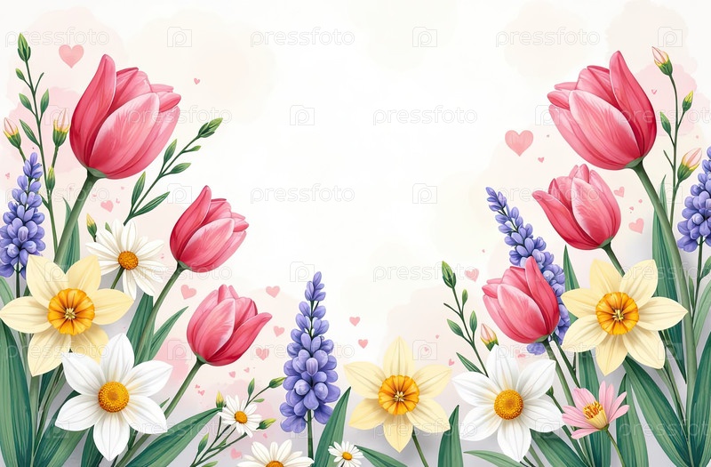 Рамка акварели с весенними цветами тюльпаны, нарциссы-Весенняя открытка со свободным местом для текста на 8 марта, женский день, Пасху