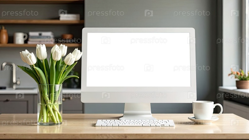 Компьютерный монитор с белым экраном макет на столе в уютном домашнем офисе с букетом весенних цветов в вазе на столе и белой чашечкой кофе