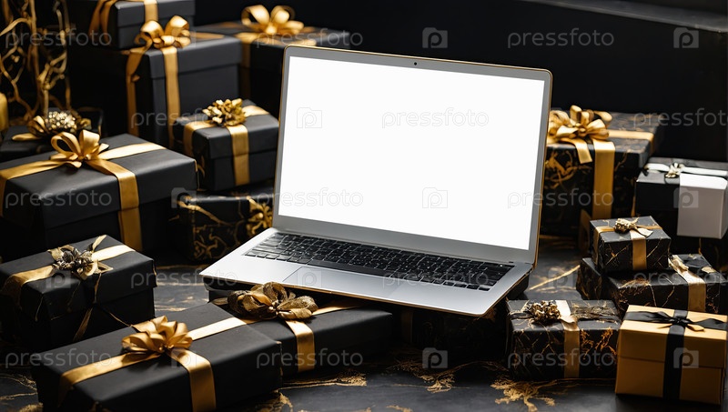 Ноутбук с белым экраном макет на столе в офисе рождественского декора с подарочными коробками для сотрудников, магазины, корпоративные подарки, Черная пятница,