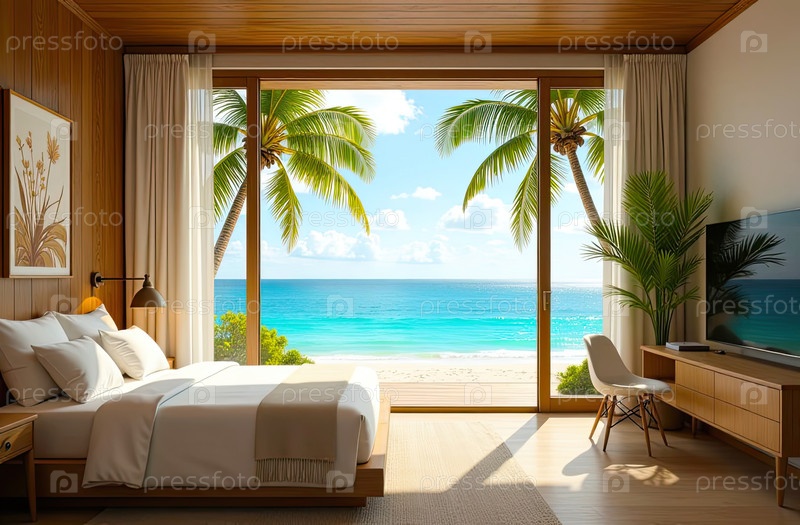 Интерьер гостиничного номера с видом на океан для пляжного отдыха и путешествий