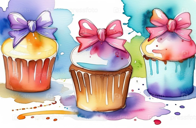Кексы и подарки линии границы, акварельные сладости вечеринки, празднование дня рождения горизонтальный фон