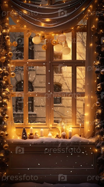 Внутреннее уютное окно с рождественским декором и теплым светом - вид изнутри зимой и снегом. отпразднуйте Рождество и Новый год, елку, боке, снег. ИИ генерируется