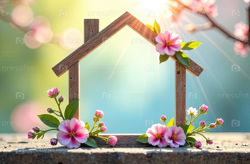 Домашняя декоративная рама в солнечных лучах, украшенная весенними пастельными цветами на весенне-синем фоне. недвижимость, риэлтор, ипотека, страхование, бронирование, строительство, изоляция. AI generated