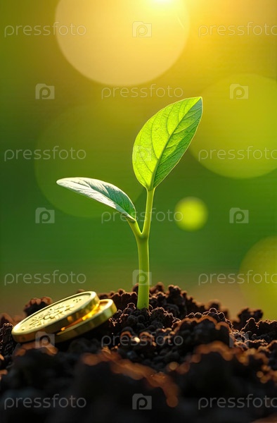 Молодой зеленый побег растет из земли и золотые монеты вблизи на зеленом фоне. Экономика, финансы, экология, стартап. ИИ генерируется
