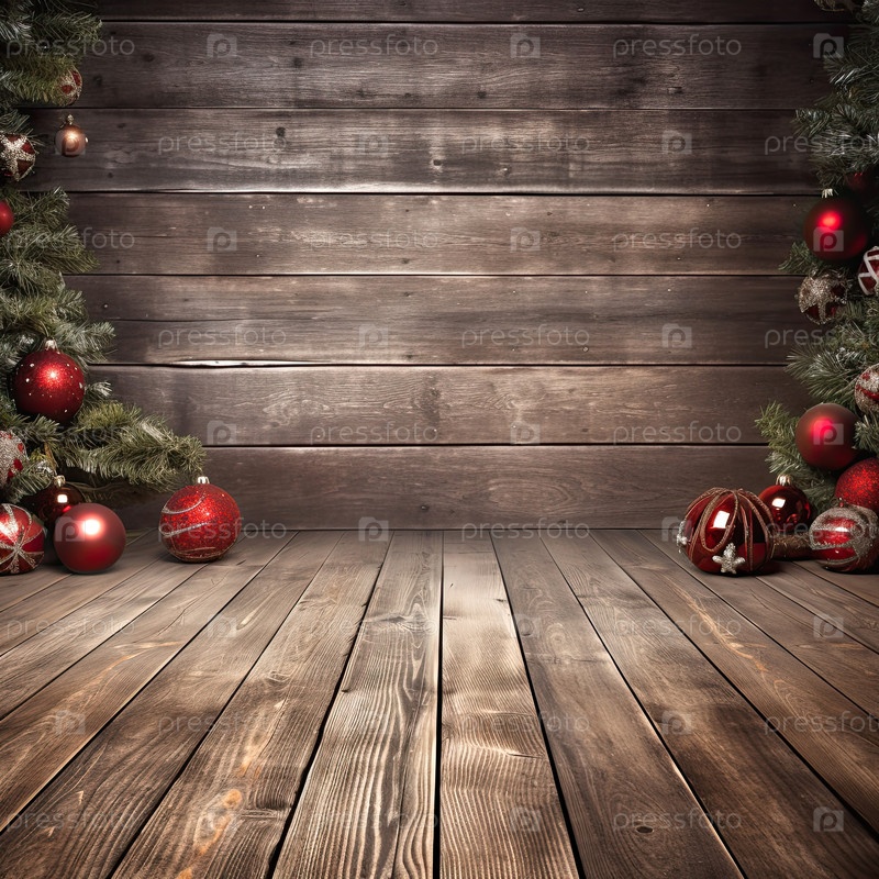 Пустой деревянный пол и стена для монтажа продуктового дисплея с рождественским декором, боке, секины и фейры. Копирование пространства, Рождество и Новый год. ИИ генерируется