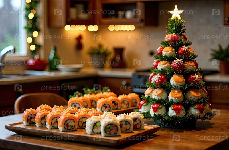 Аппетит быстрого питания в виде рождественской елки из рулонов, суши, красной рыбы на праздничном новогоднем столе. меню, рецепт и красивая презентация, доставка из ресторана. ИИ генерируется;
