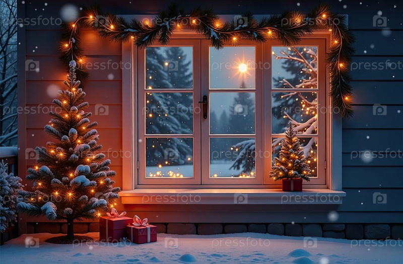 Наружное уютное окно с рождественским декором и теплым светом внутри - вид снаружи дома. отпразднуйте Рождество и Новый год, елку, боке, снег. созданный ИИ