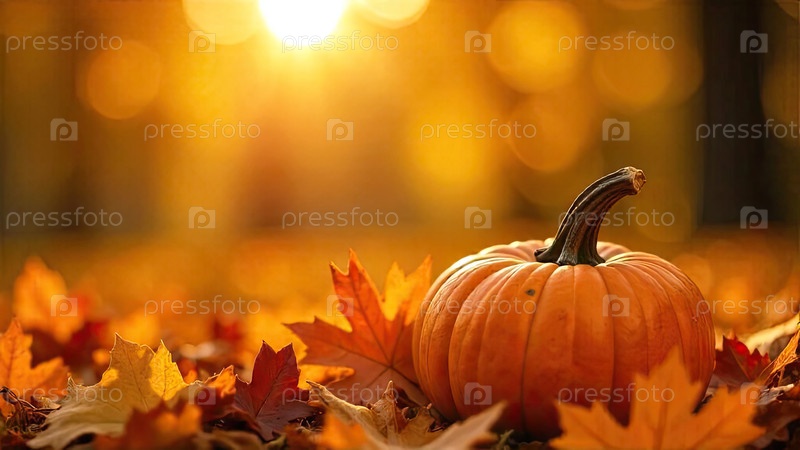 Осенний фон с золотыми листьями и тыквой в лучах солнца. баннер урожая и Хэллоуин, флаер со копировальным пространством. созданный ИИ