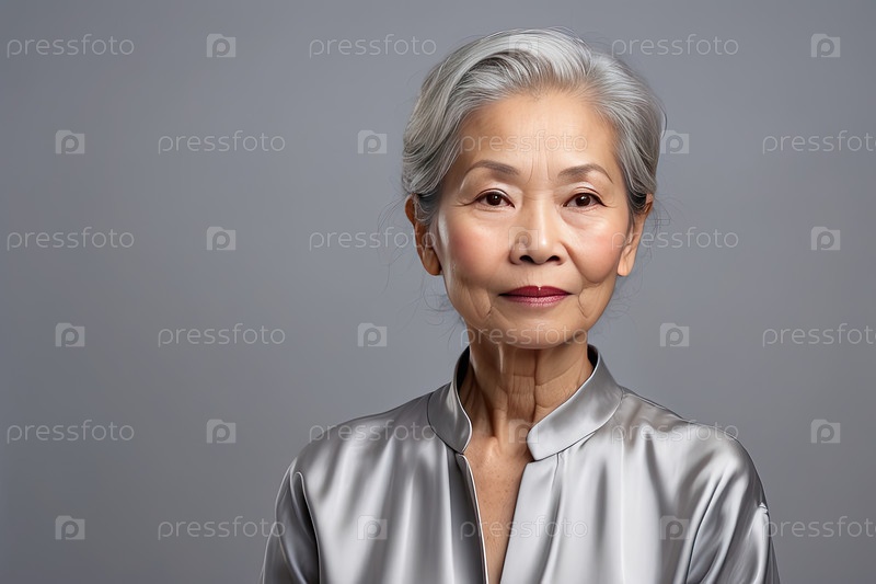 Студийный портрет пожилой женщины с седыми волосами в стильном серебряном наряде, выглядящей уверенно, позитивным старением, зрелой красотой, вдохновляющим образом жизни, вневременной элегантностью