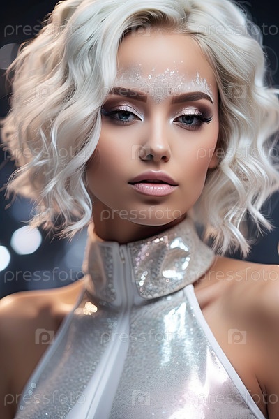 Европейская блондинка с яркими глазами, блестящими партийными губами, сияющим тоном кожи, серебристым праздничным гламурным макияжем, зимним вечером