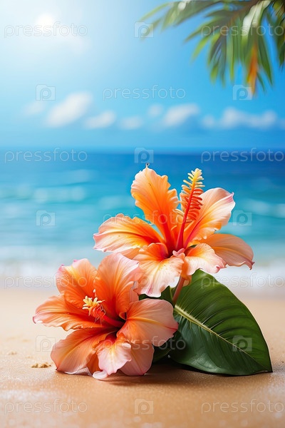 Минимальный цветочный тропический заголовок, синий фон, яркие цветы, место для текста, объявления или приветственного сообщения, летнее копирование
